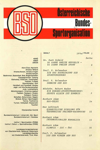 Von Herbst 1970 bis Anfang 1983 (Heft 1/2) erscheint mit „BSO Österreichische Bundes-Sportorganisation“ die erste Zeitschrift, welche neben News der BSO und ihrer Mitgliedsverbände auch Informationen der verschiedenen Sportinstitutionen, Landessportorganisationen und ab Folge 3 (1971) „offiziell“ im Untertitel auch Mitteilungen des zuständigen Unterrichtsministeriums beinhaltet.